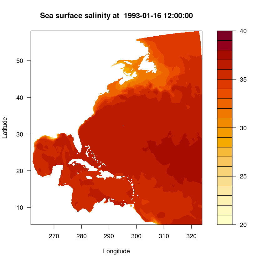 sos <- ncvar_get(ncopendap, "sos", start = c(1, 1, timeslice), count = c(-1, -1, 1))# the matrix output of sea surface salinity