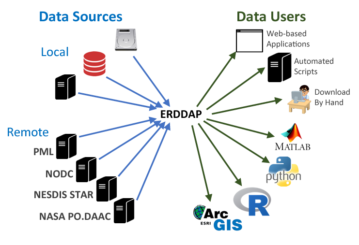 The goal behind ERDDAP is to make it easier for you to get scientific data. To accomplish that goal, ERDDAP acts as a middleman, selectively channeling datasets from remote and local data sources to a single data portal. With ERDDAP as the single-source portal, you have access to a simple, consistent way to download subsets of gridded and tabular scientific datasets in common file formats, with options and make graphs and maps.
