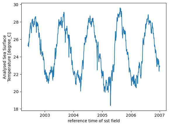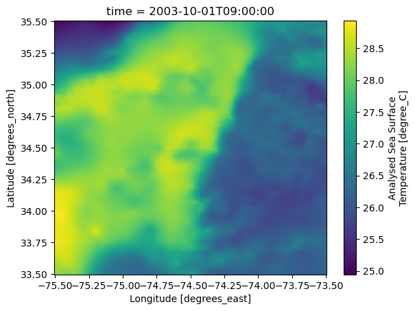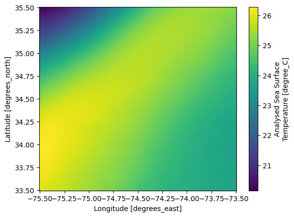 We can open ERDDAP gridded dataset collections with xarray. ERDDAP automatically creates an aggregated metadata layer that combines all granules in a collection. We can then call xarray.open_dataset(collection_url) to get a data cube without having to point to all the individual files. Make sure that the collection url points to the dataset without any subsetting specification. Under the hood, xarray will load the collection metadata (lazily). After loading, you can subset the full collection data as needed.